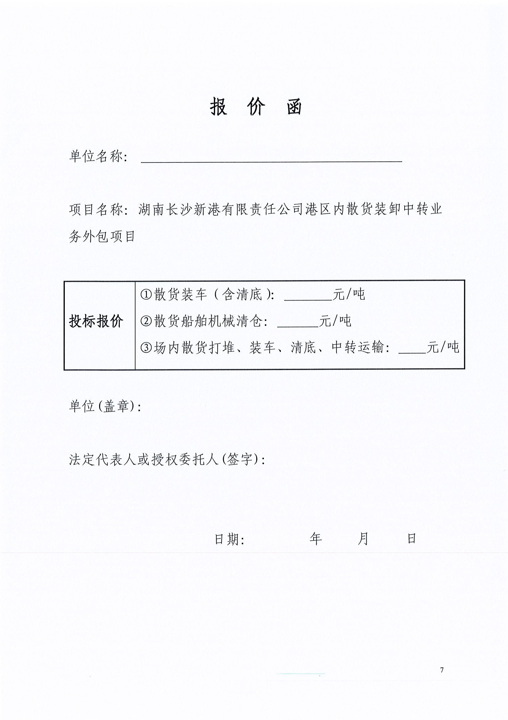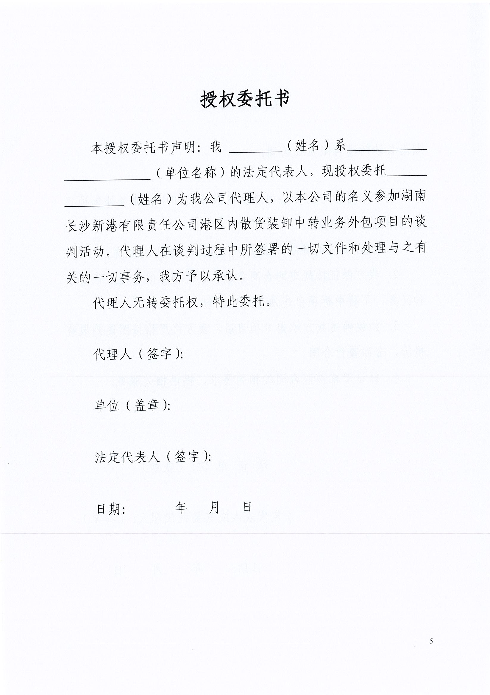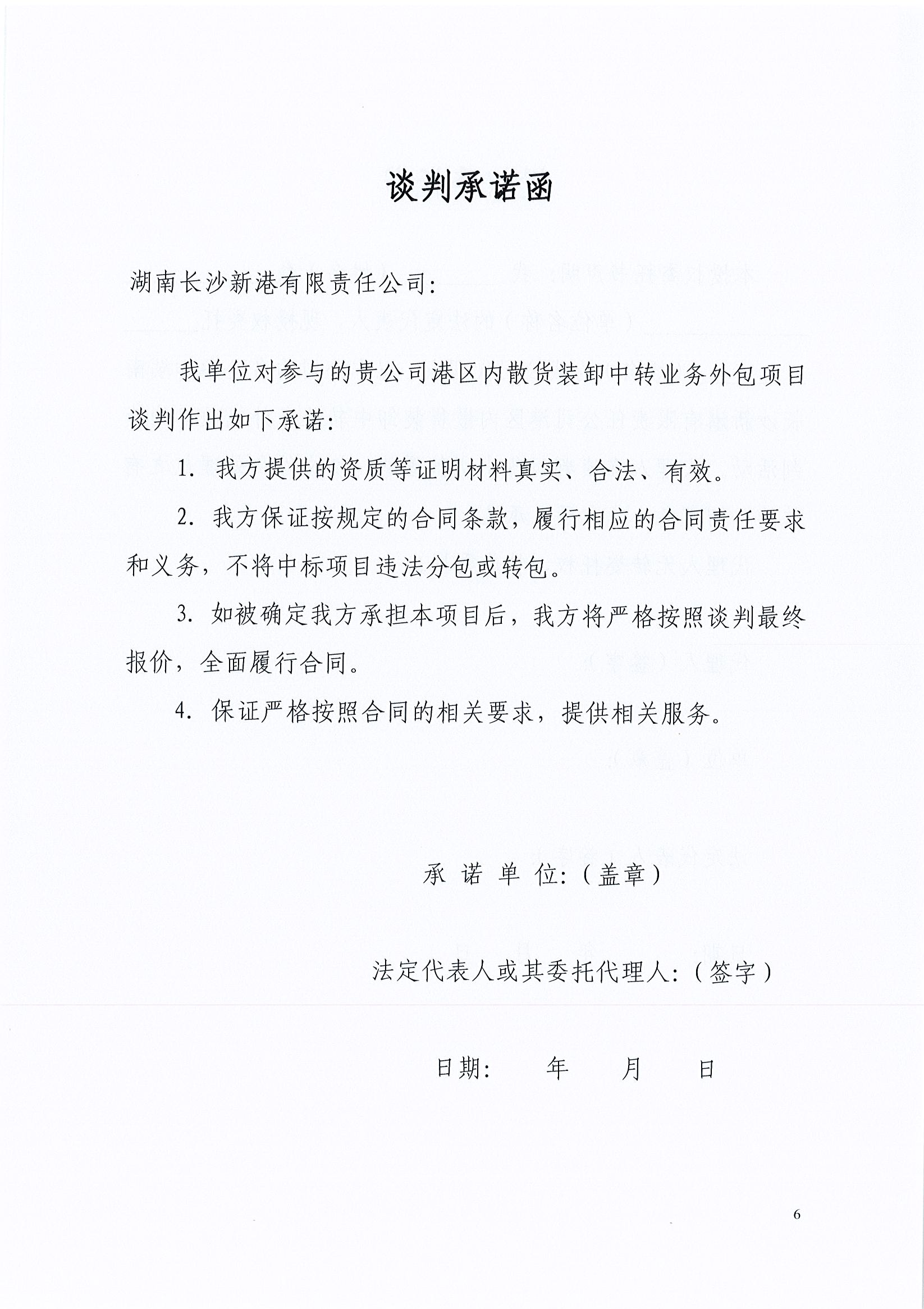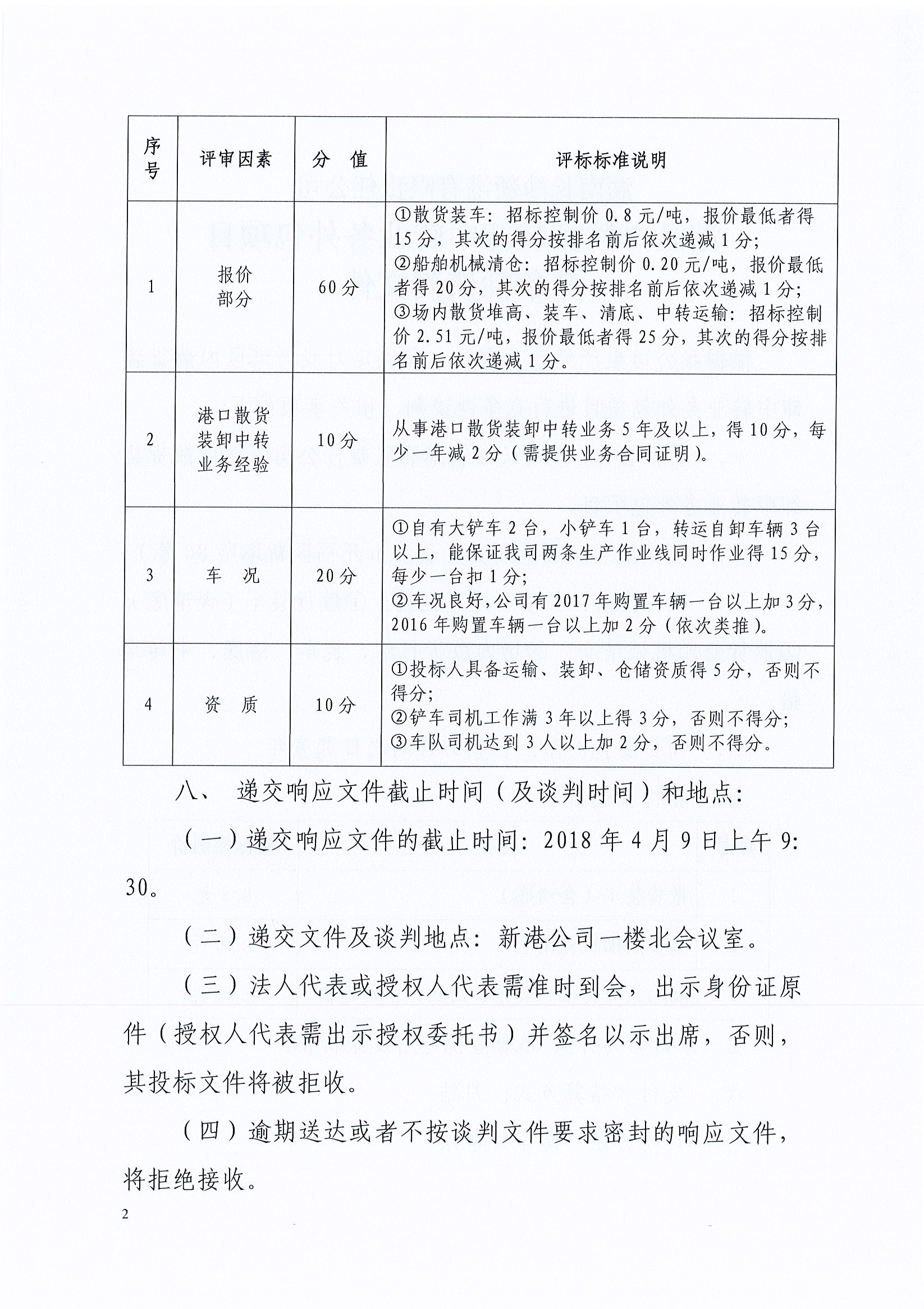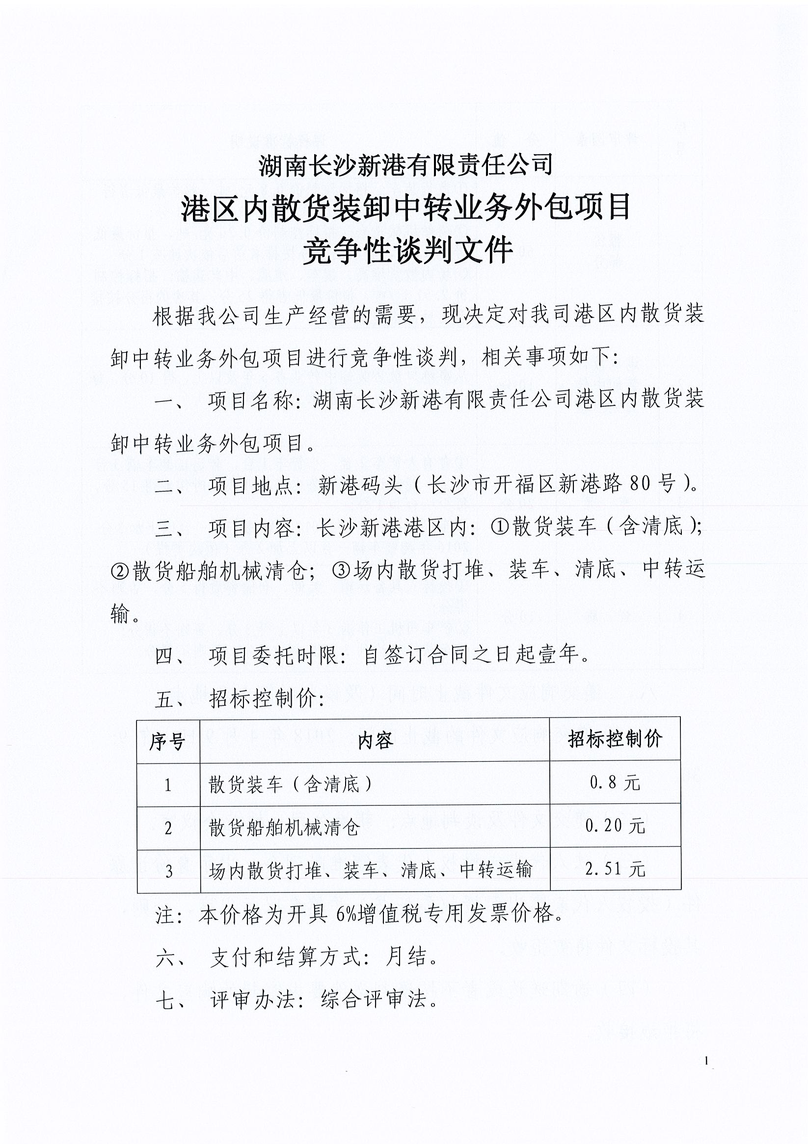 我公司決定對(duì)港區(qū)內(nèi)散貨裝卸中轉(zhuǎn)業(yè)務(wù)外包項(xiàng)目按照一般競(jìng)爭(zhēng)性談判方式選擇外包單位,歡迎符合條件的單位參與項(xiàng)目的競(jìng)爭(zhēng)談判。 一、 項(xiàng)目名稱:湖南長(zhǎng)沙新港有限責(zé)任公司港區(qū)內(nèi)散貨裝卸中轉(zhuǎn)業(yè)務(wù)外包項(xiàng)目 二、 項(xiàng)目?jī)?nèi)容: 長(zhǎng)沙新港港區(qū)內(nèi):①散貨裝車(含清底);②散貨船舶機(jī)械清倉(cāng);③場(chǎng)內(nèi)散貨打堆、裝車、清底、中轉(zhuǎn)運(yùn)輸。 三、 項(xiàng)目委托期限:自簽訂合同之日起壹年。 四、 資格及資質(zhì)要求: (一)本項(xiàng)目不接受聯(lián)合體投標(biāo); (二)投標(biāo)人須自有大鏟車、小鏟車、轉(zhuǎn)運(yùn)自卸車輛,能保證我司兩條生產(chǎn)作業(yè)線同時(shí)作業(yè); (三)投標(biāo)人鏟車司機(jī)、車隊(duì)司機(jī)須持有相關(guān)職業(yè)資格證; (四)投標(biāo)人遞交響應(yīng)文件時(shí)須提交以下證明材料(復(fù)印件需加蓋公章): 1.企業(yè)法人營(yíng)業(yè)執(zhí)照副本復(fù)印件; 2.法人資格證明書或具有單位公章及法定代表人簽章的授權(quán)委托書、法人身份證原件(或復(fù)印件); 3.投標(biāo)人自有車輛購(gòu)置證明材料、司機(jī)職業(yè)資格證明材料復(fù)印件; 4.投標(biāo)人類似項(xiàng)目業(yè)績(jī)證明材料; 5.投標(biāo)人身份證原件及復(fù)印件。 五、招標(biāo)文件的獲取方式:招標(biāo)文件見(jiàn)本公告附件,投標(biāo)人在投標(biāo)截止時(shí)間前可自行下載或前往我司515室領(lǐng)取。 六、遞交響應(yīng)文件截止時(shí)間(及談判時(shí)間)和地點(diǎn): (一)遞交響應(yīng)文件的截止時(shí)間:2018年4月9日上午9:30。 (二)遞交文件及談判地點(diǎn):新港公司一樓北會(huì)議室。 (三)法人代表或授權(quán)人代表需準(zhǔn)時(shí)到會(huì),出示身份證原件(授權(quán)人代表需出示授權(quán)委托書)并簽名以示出席,否則,其投標(biāo)文件將被拒收。 (四)逾期送達(dá)或者不按談判文件要求密封的響應(yīng)文件,將拒絕接收。 七、招 標(biāo) 方:湖南長(zhǎng)沙新港有限責(zé)任公司 聯(lián) 系 人:周明德 聯(lián)系電話: 15874888034 2018年4月3日 附件: