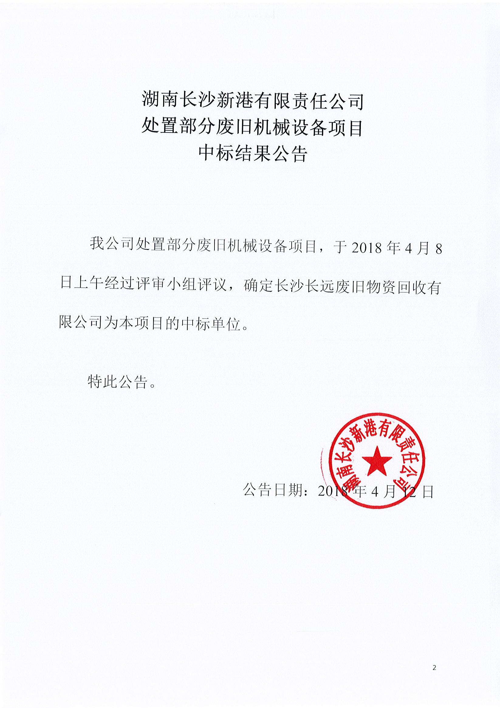 湖南長沙新港有限責(zé)任公司 處置部分廢舊機械設(shè)備項目中標(biāo)結(jié)果公告