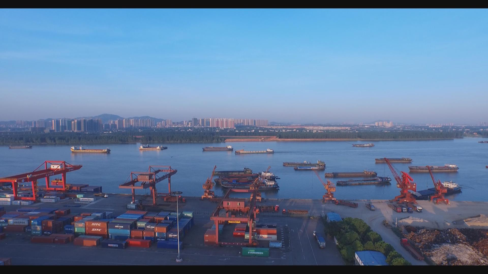 在岳陽(yáng)城陵磯港,記者劉媛源介紹說(shuō):“為了更好地利用湖南良好的水運(yùn)資源,長(zhǎng)沙與岳陽(yáng)打出了一套漂亮的組合拳。我現(xiàn)在所在的位置就是岳陽(yáng)市的城陵磯新港,經(jīng)過(guò)不到一天的航行,那批從長(zhǎng)沙新港順流而下的貨物正在這里進(jìn)行新一輪的裝卸,這些貨物將乘坐我身后更加重量級(jí)的貨輪,從這里啟程運(yùn)往海外。”