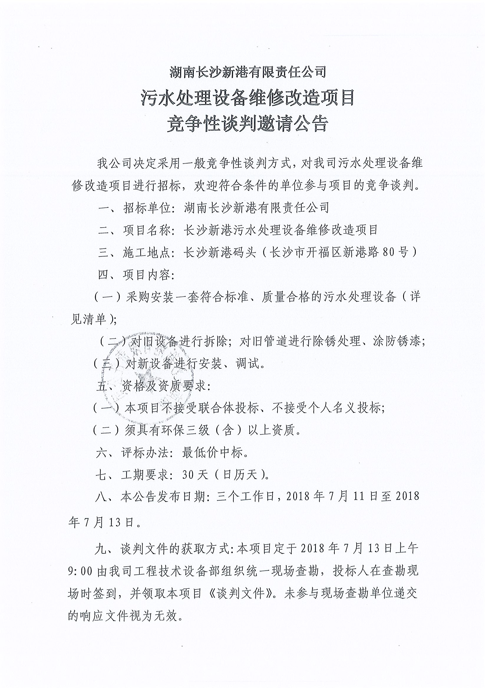 湖南長沙新港有限責任公司 污水處理設備維修項目競爭性談判邀請公告