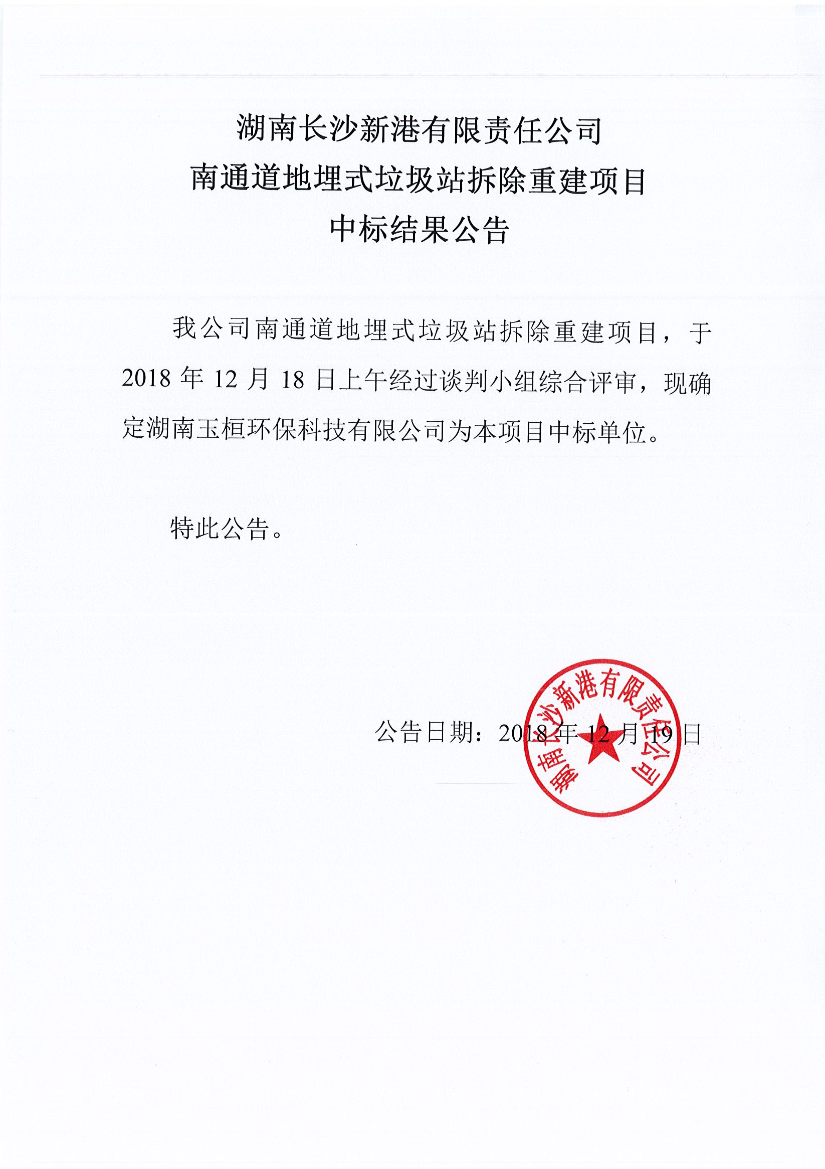 湖南長沙新港有限責任公司 南通道地埋式垃圾站拆除重建項目中標公告