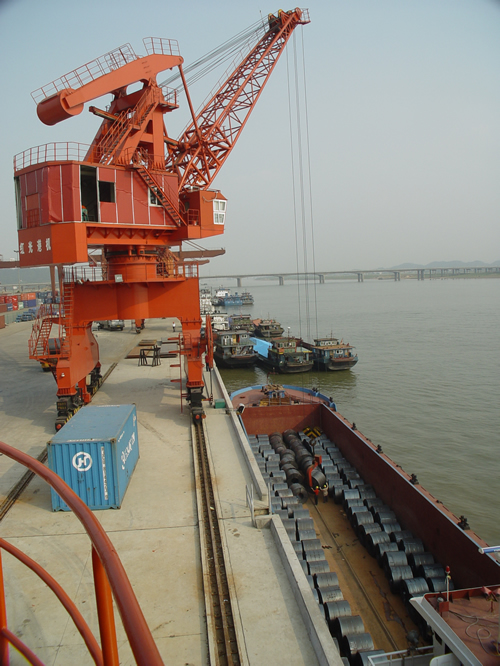由于湘江提前進入枯水期,10月上旬以來上游湘潭、株洲航段降至歷史最枯水位,因受水位制約,導致漣鋼出口伊朗的卷鋼板被迫陸運到長沙新港水路發運出口。圖為10月11日,操作人員為首批卷鋼板捆扎加工和裝船前的場景。