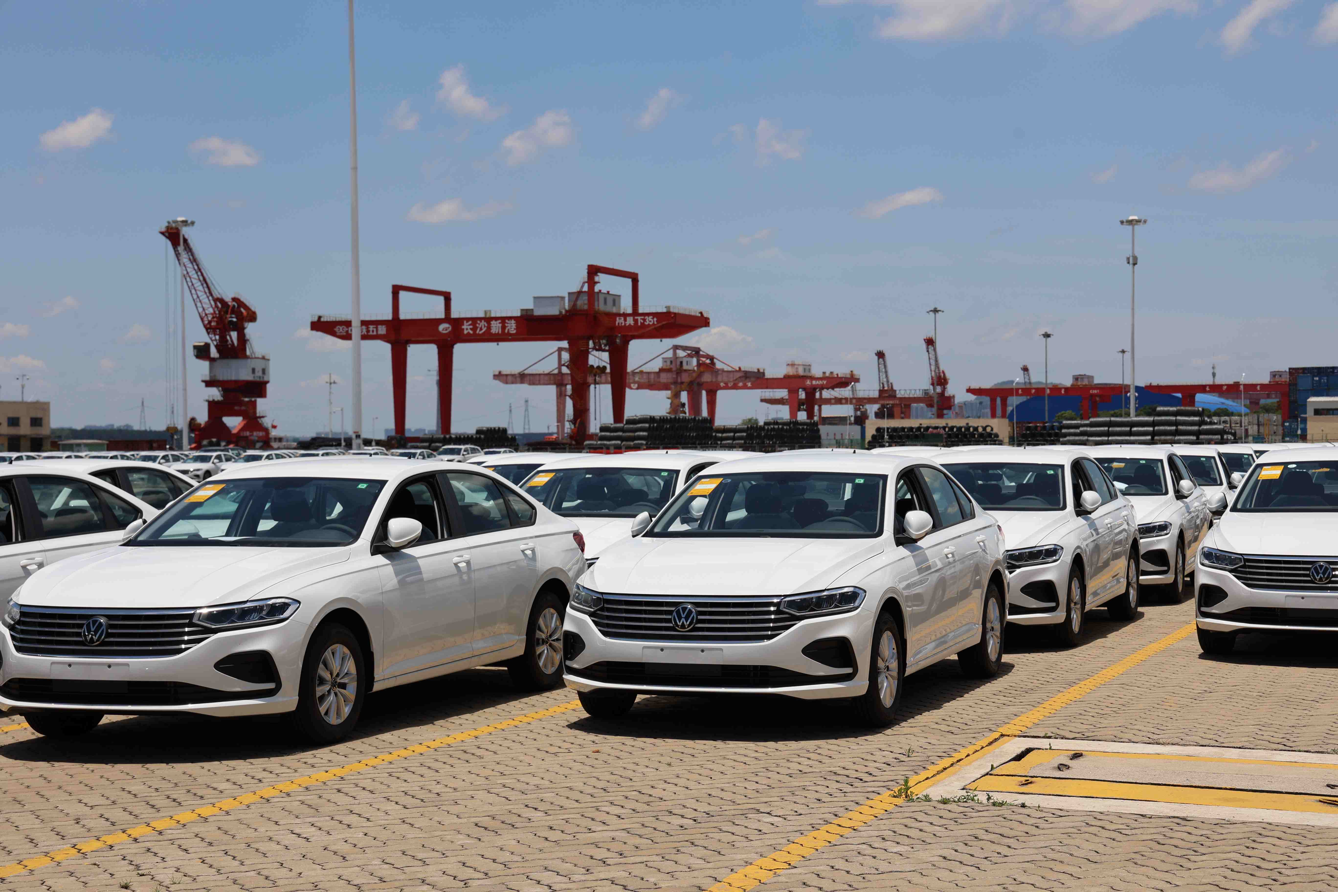 在歷經十小時作業后,該批次車輛全部順利集港裝船。殘霞潛江波光爍,船鳴三聲水天開。18時,“港達6號” 滾裝船滿載357臺上汽大眾汽車,沐浴晚霞余暉,順利駛出長沙新港碼頭。