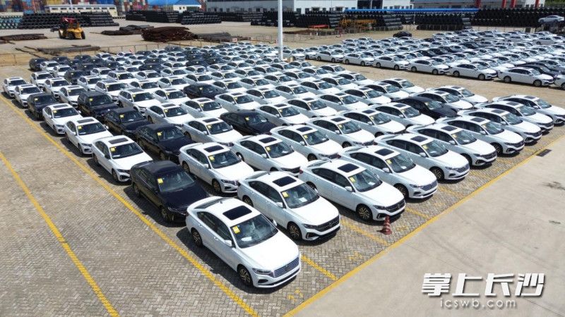 在長沙新港滾裝堆場裝車區,停放著一批在長沙完成生產的上汽大眾成品車,即將發往上海、安徽、江蘇等地。長沙晚報通訊員 金添毅 攝
