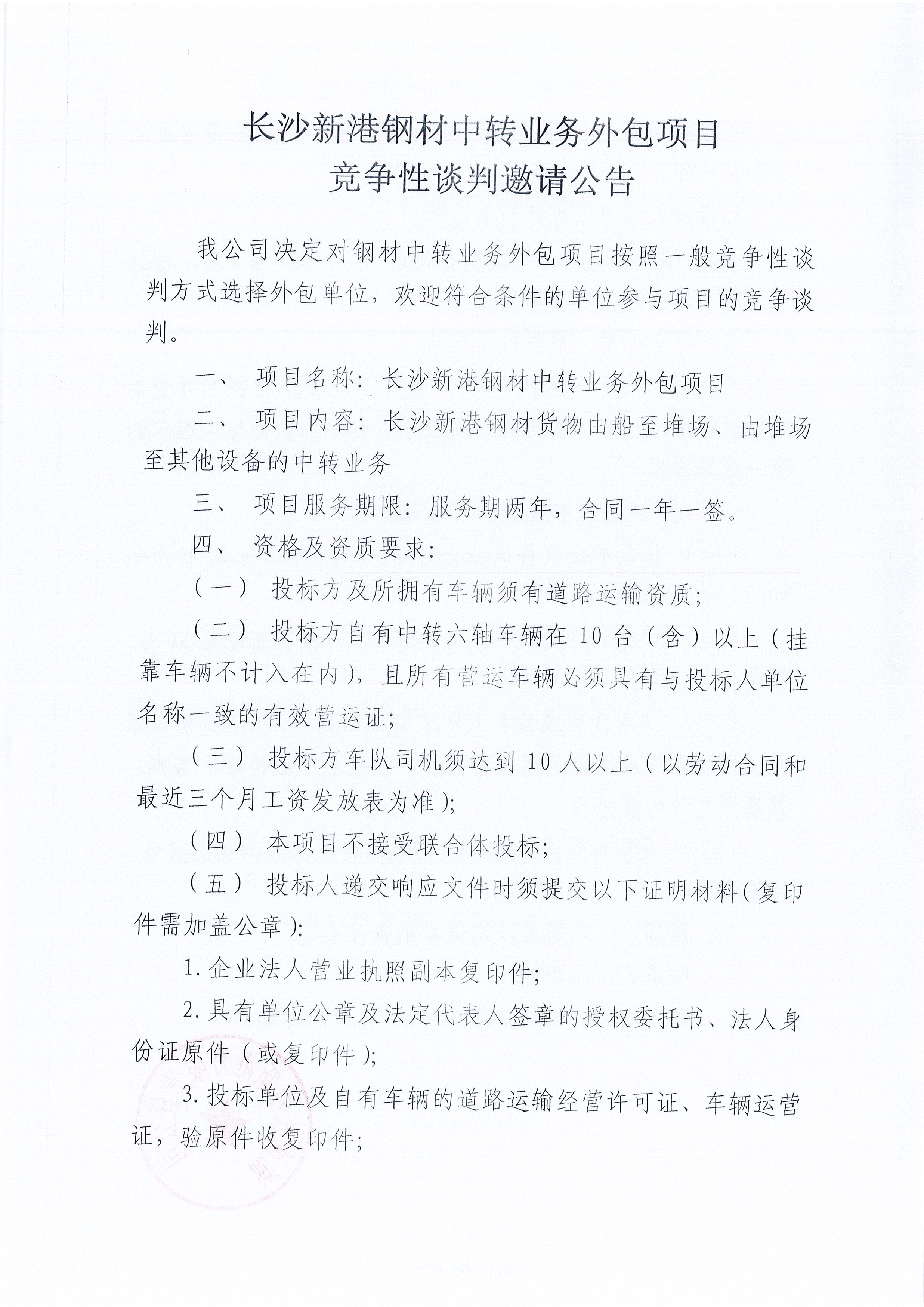 長沙新港鋼材中轉業務外包項目競爭性談判邀請公告