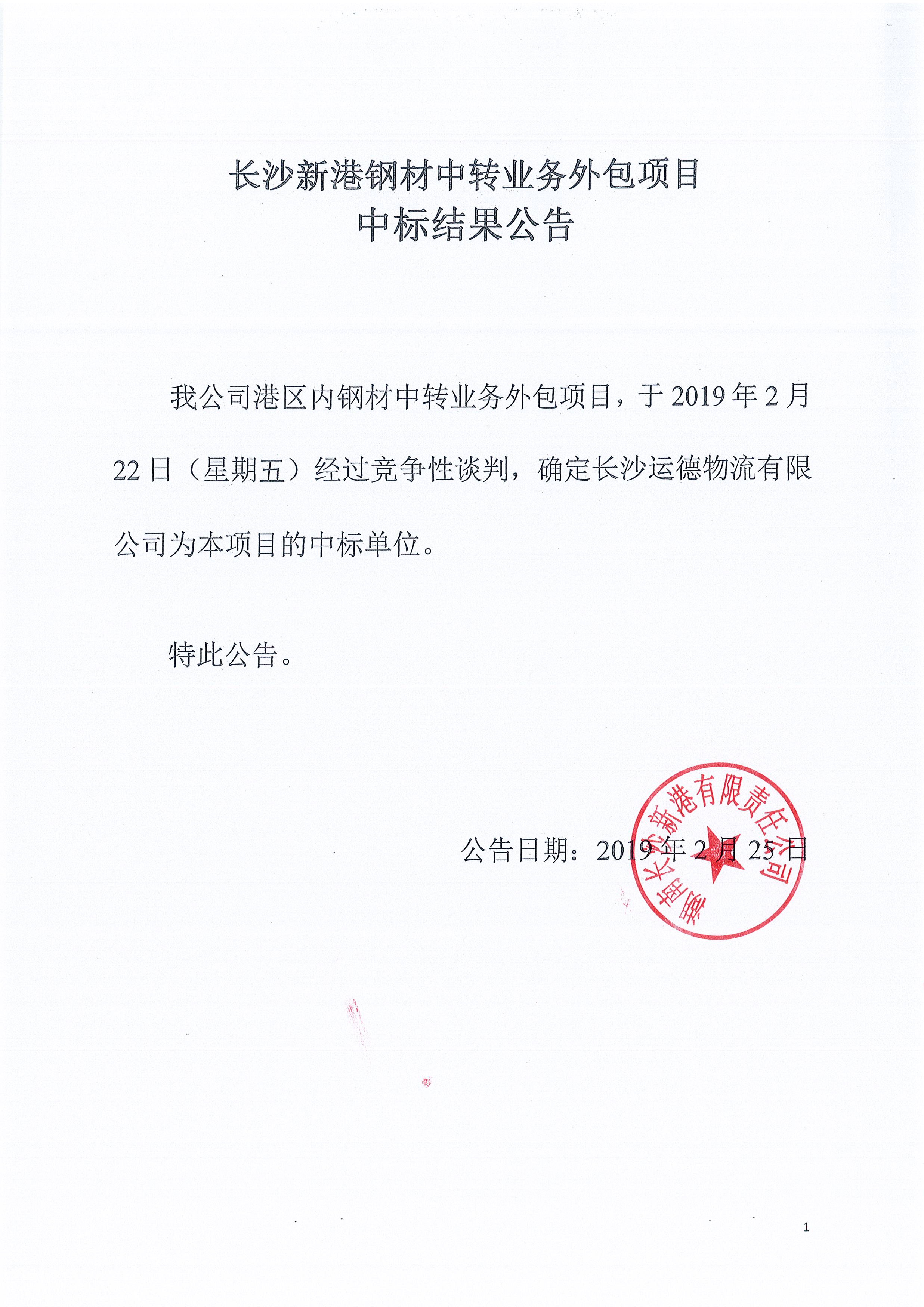 長沙新港鋼材中轉業務外包項目中標結果公告