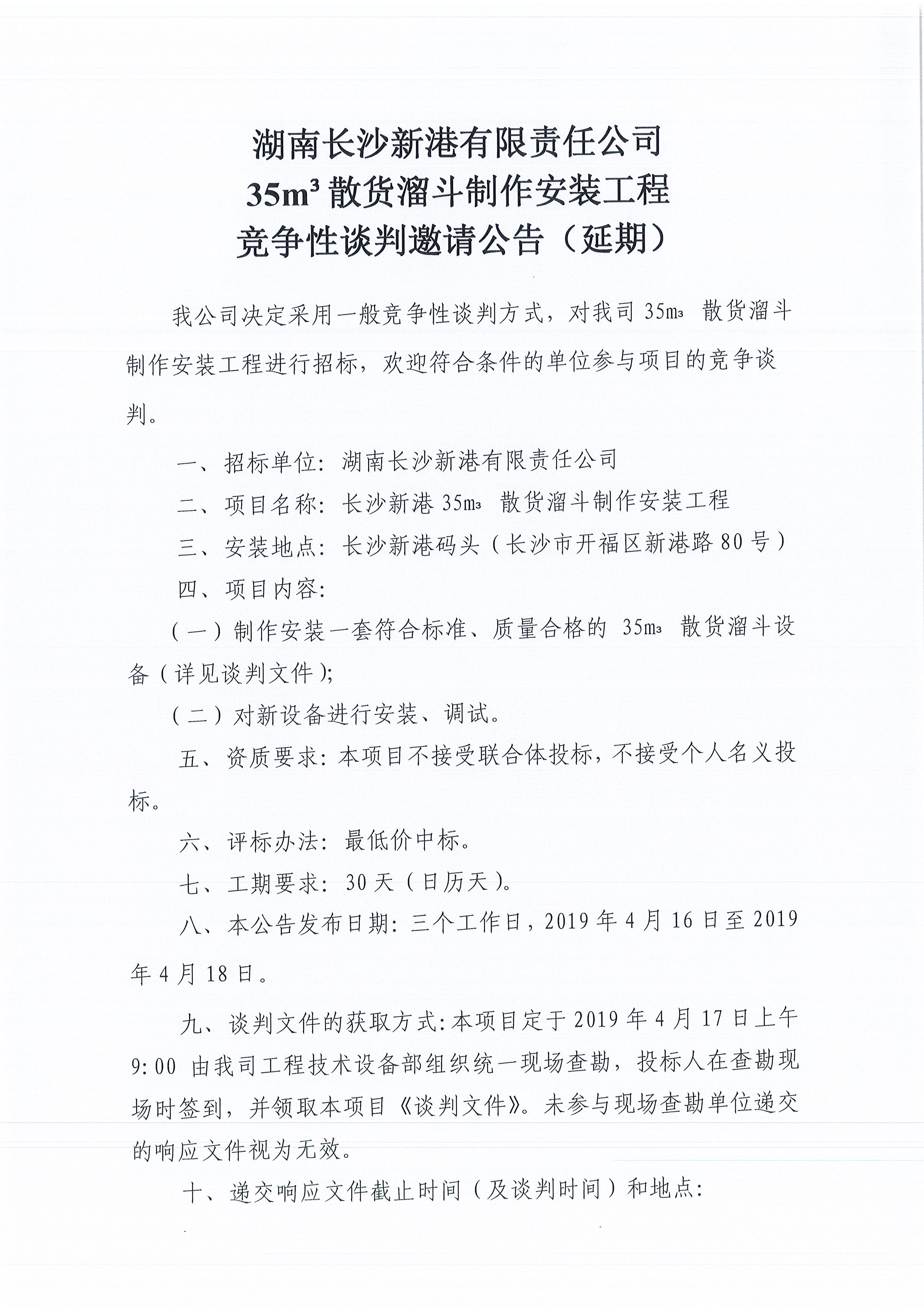 湖南長沙新港有限責任公司35m³散貨溜斗制作安裝工程競爭性談判邀請公告(延期))