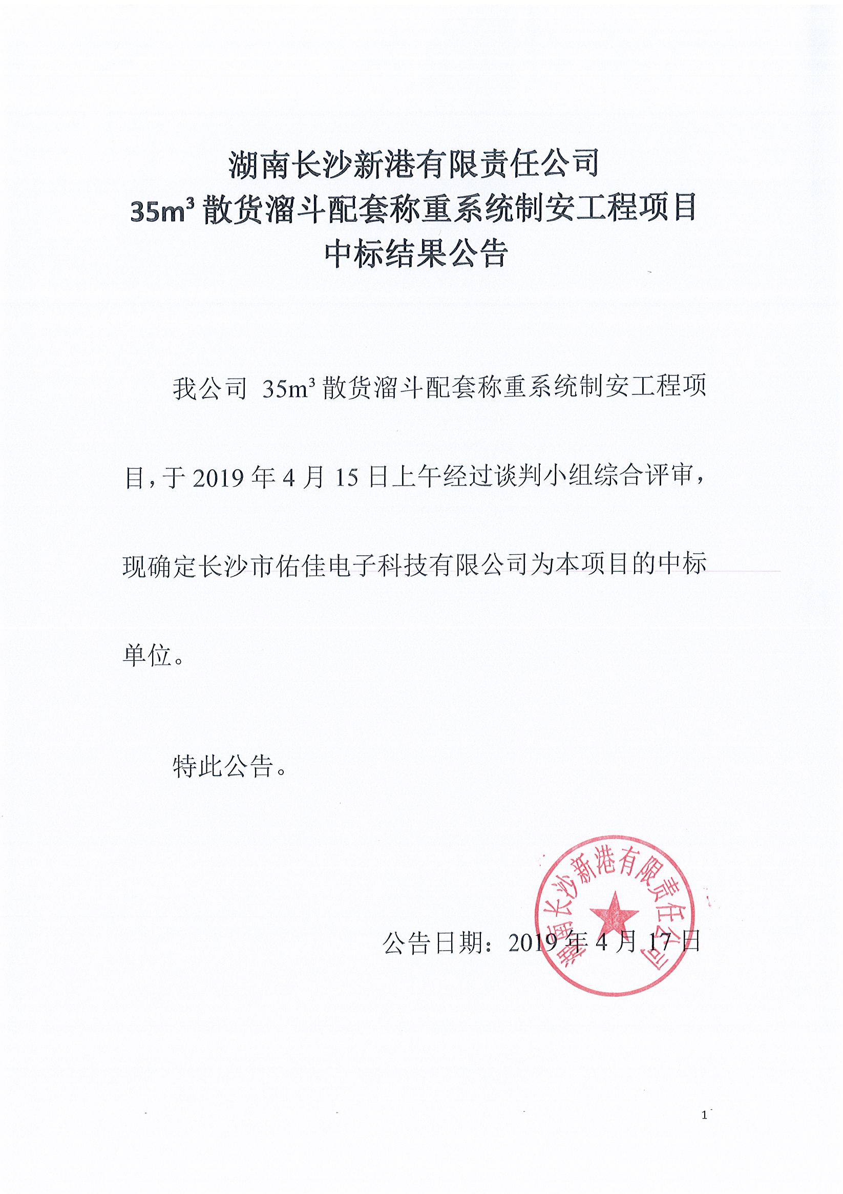 湖南長沙新港有限責任公司35m³散貨溜斗配套稱重系統制安工程項目中標結果公告