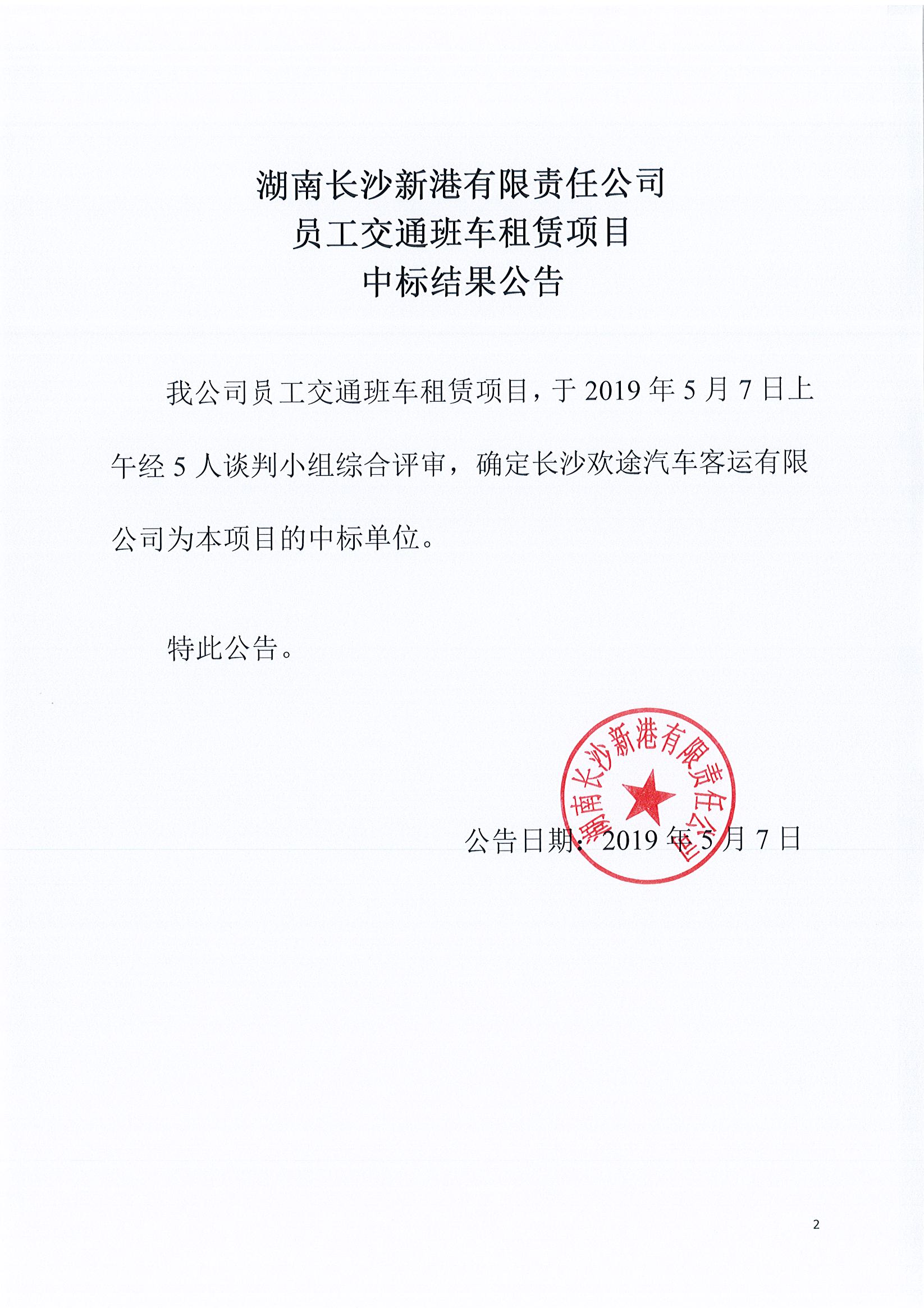 湖南長沙新港有限責任公司員工交通班車租賃項目中標結(jié)果公告