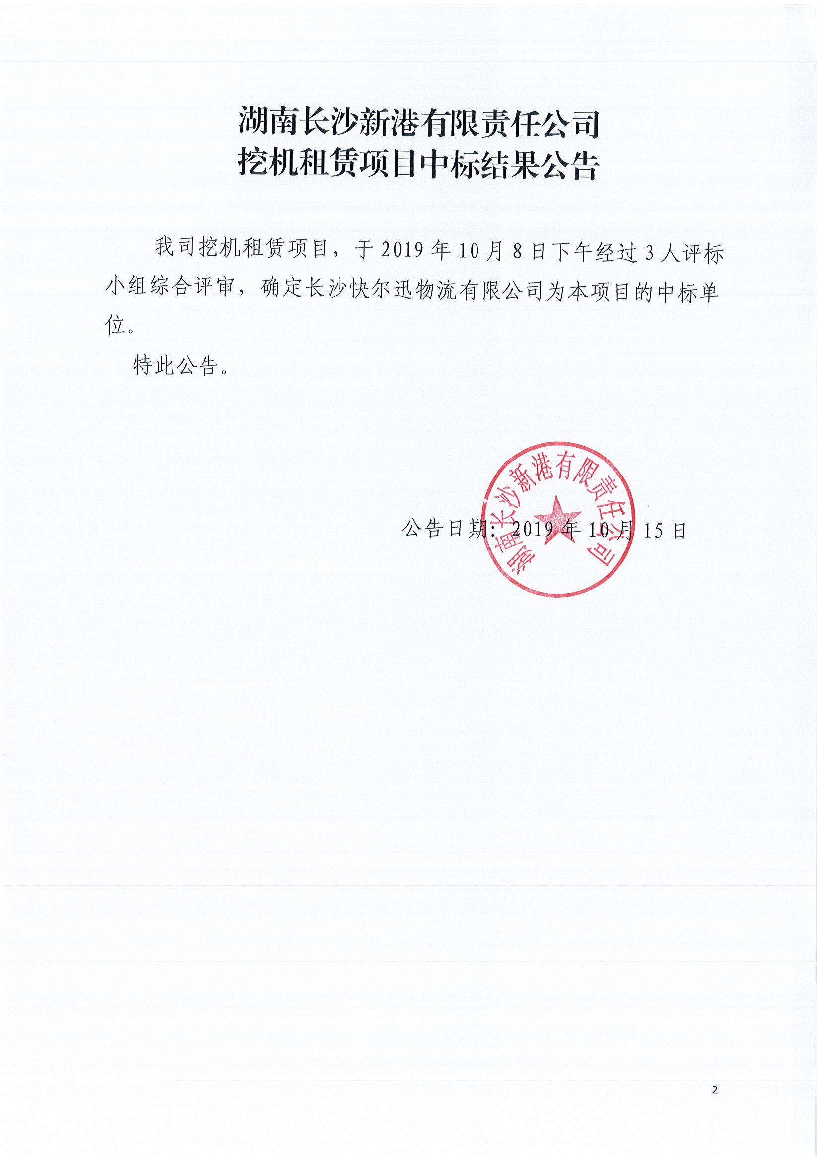 湖南長沙新港有限責任公司挖機租賃項目中標結(jié)果公告