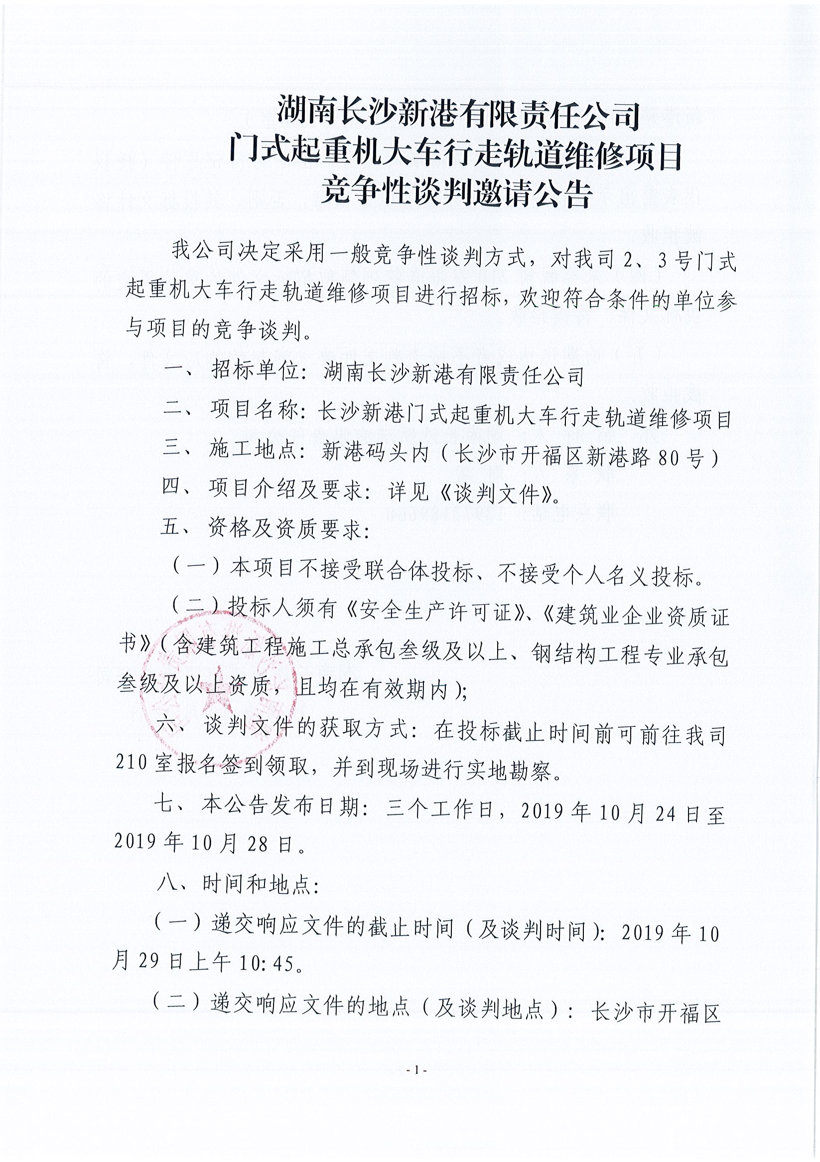 湖南長沙新港有限責任公司門式起重機大車行走軌道維修項目競爭性談判邀請公告