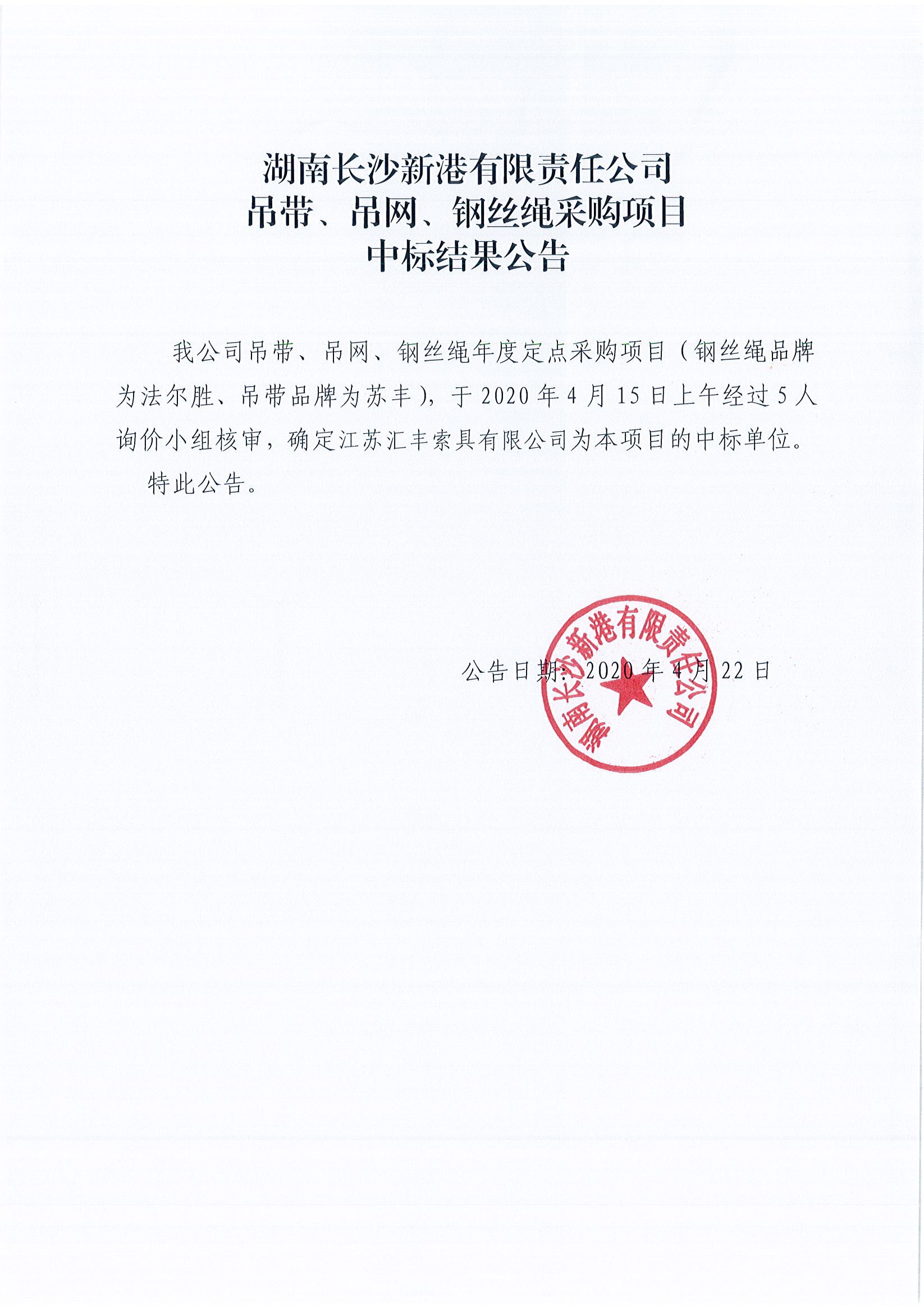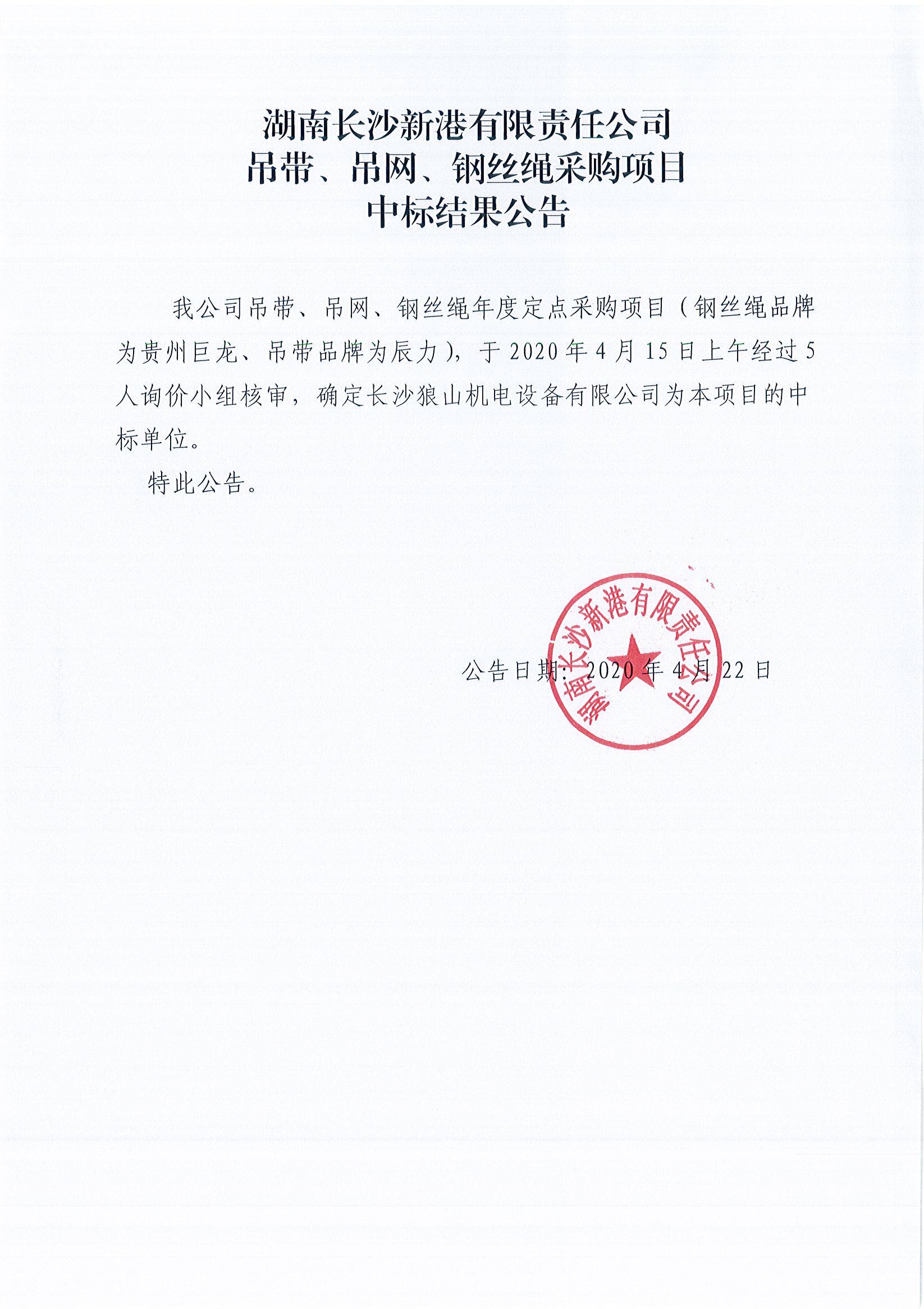 湖南長沙新港有限責(zé)任公司吊帶、吊網(wǎng)、鋼絲繩采購項目中標結(jié)果公告