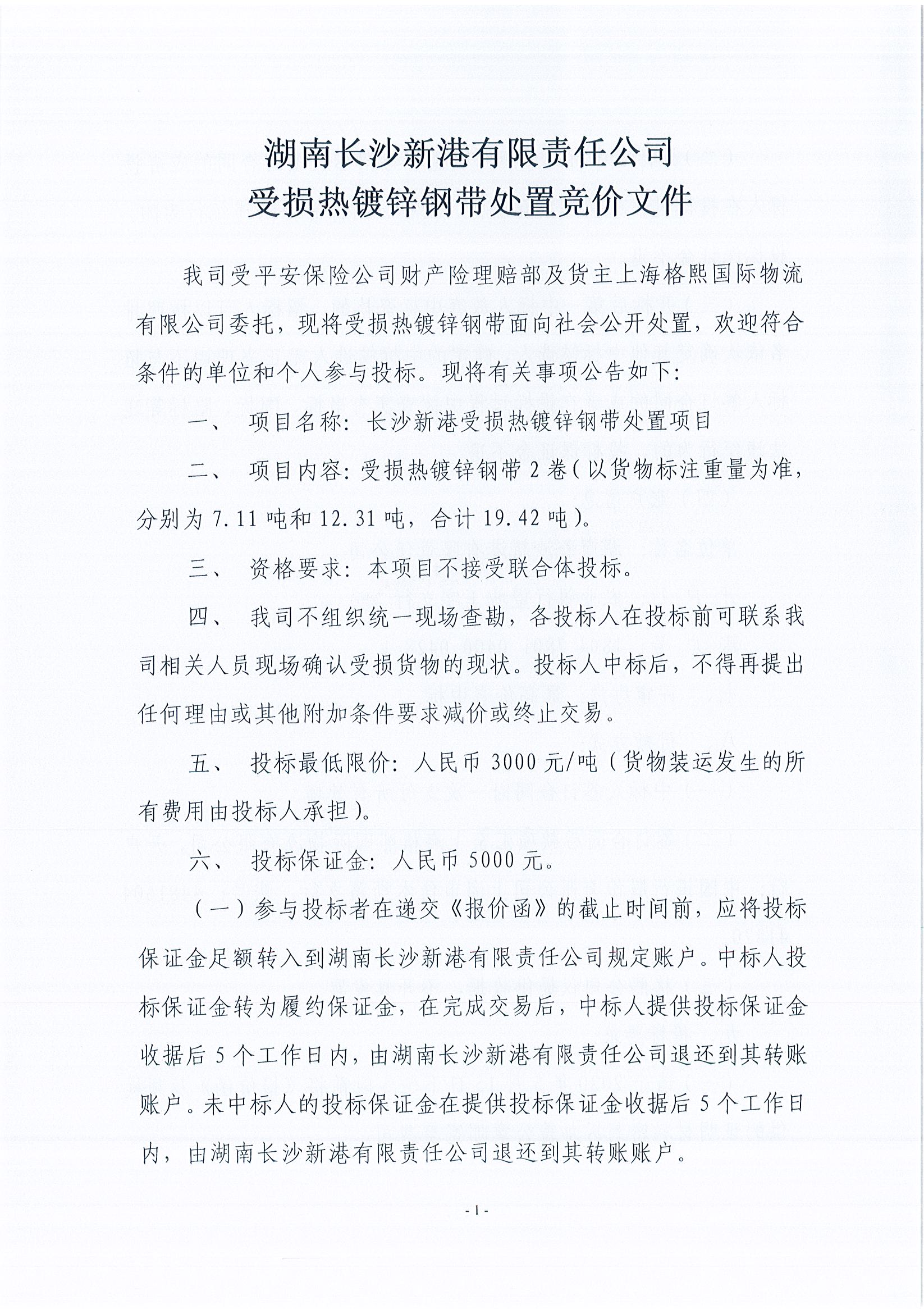 湖南長沙新港有限責任公司受損熱鍍鋼帶外置競價文件