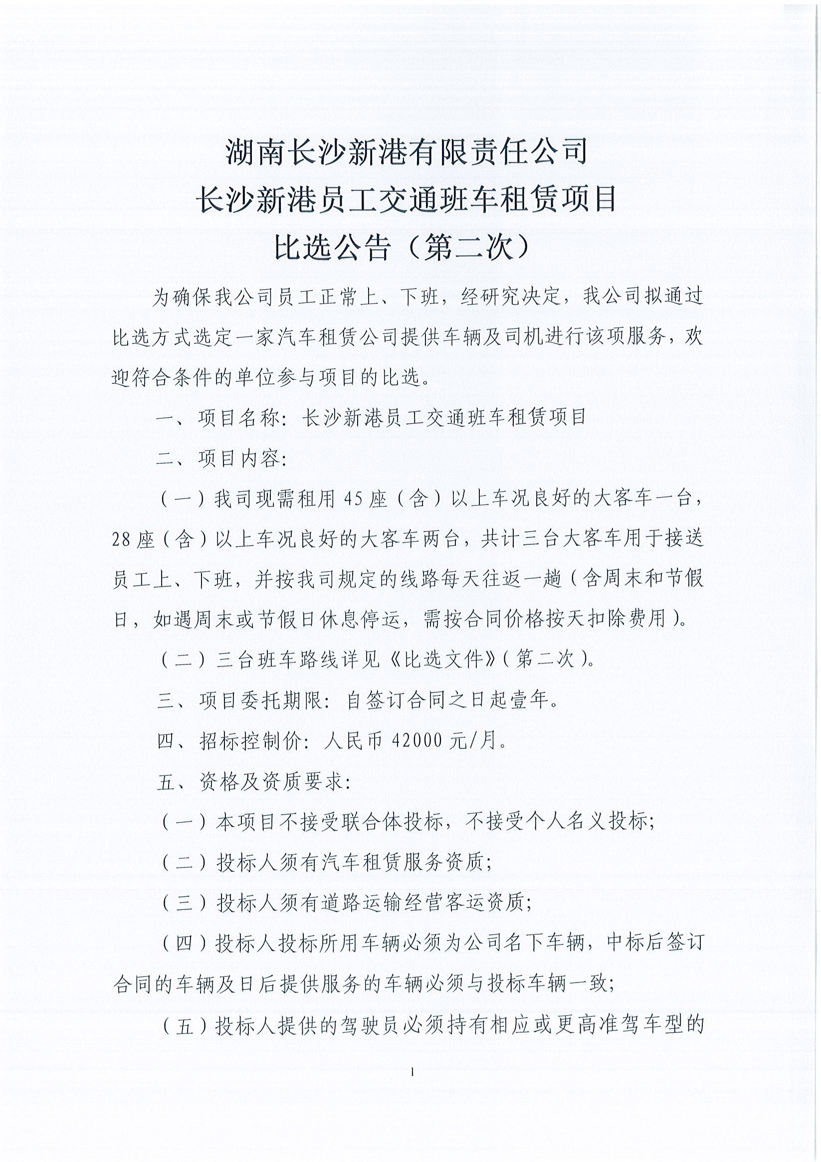 湖南長(zhǎng)沙新港有限責(zé)任公司長(zhǎng)沙新港員工交通班車租賃項(xiàng)目比選公告(第二次)
