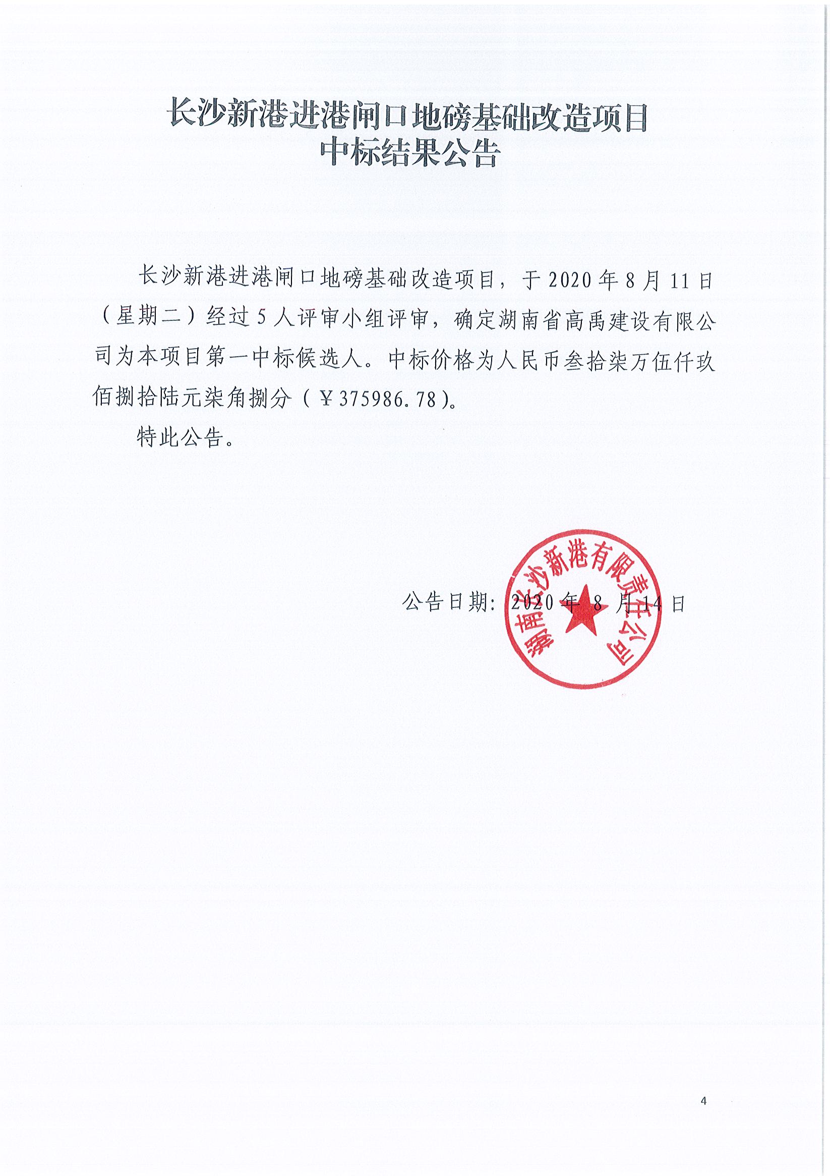 長沙新港進港閘口地磅基礎改造項目中標結果公告