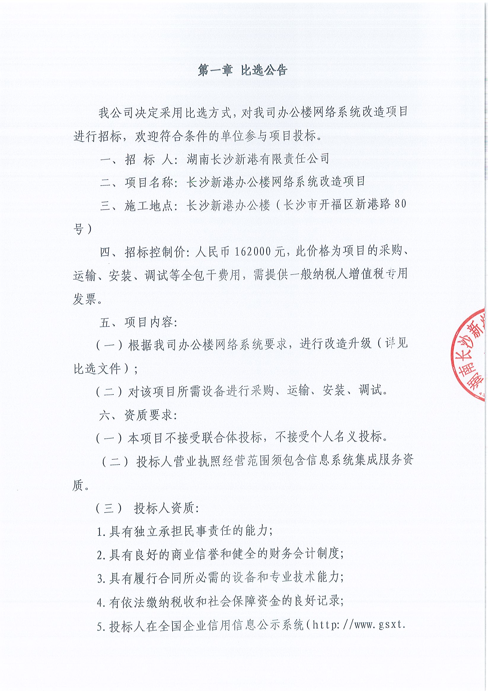 湖南長沙新港有限責任公司辦公樓網絡系統改造項目招標公示