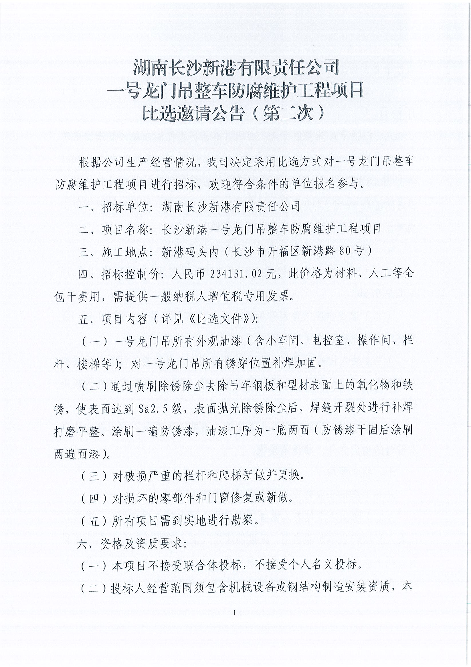 湖南長沙新港有限責任公司一號龍門吊整車防腐維護工程比選邀請公告(第二次)