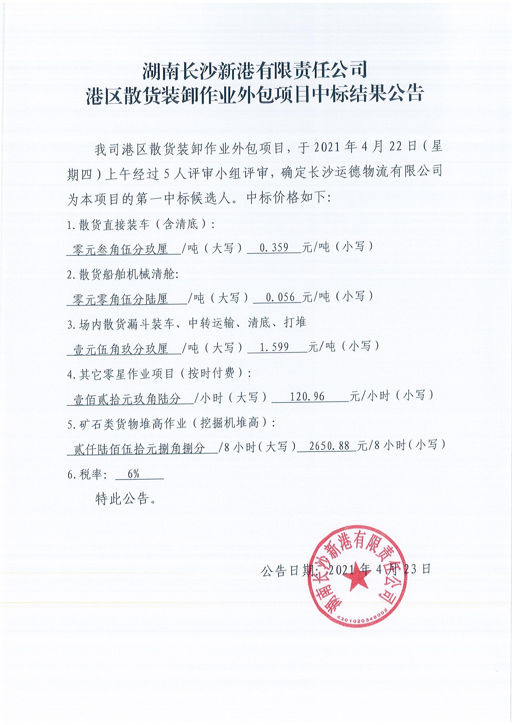 湖南長(zhǎng)沙新港有限責(zé)任公司港區(qū)散貨裝卸作業(yè)外包項(xiàng)目中標(biāo)結(jié)果公告