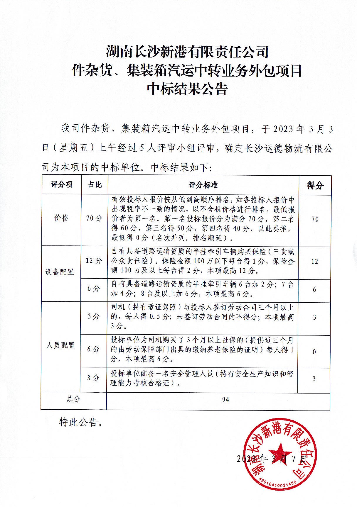 湖南長沙新港有限責(zé)任公司件雜貨、集裝箱汽運(yùn)中轉(zhuǎn)業(yè)務(wù)外包項(xiàng)目中標(biāo)結(jié)果公告