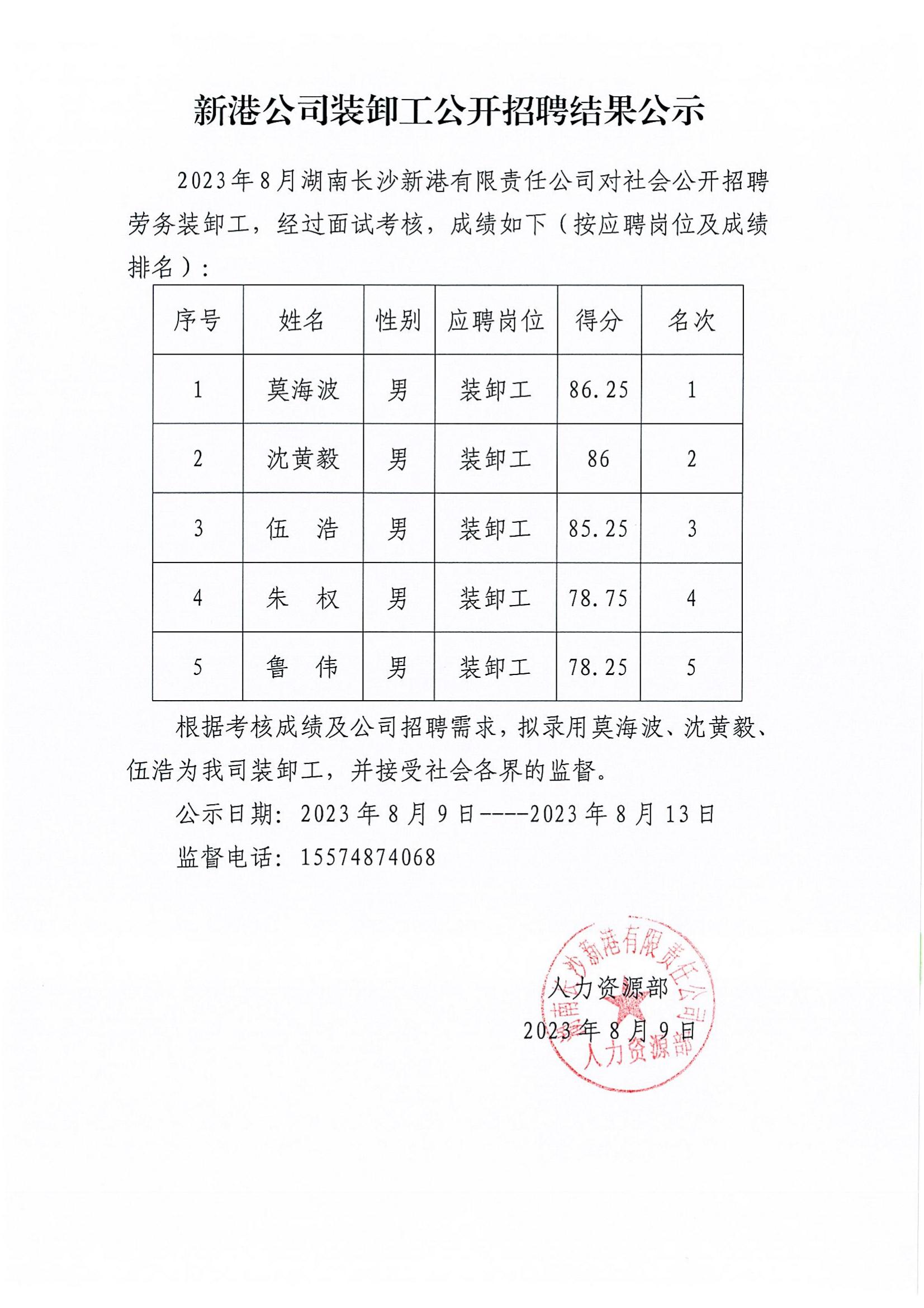 新港公司裝卸工公開招聘結(jié)果公示