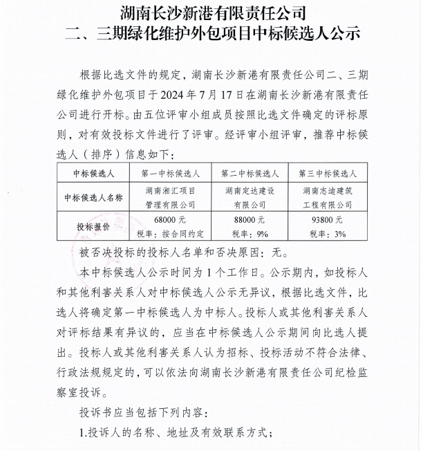 湖南長沙新港有限責任公司二、三期綠化維護外包項目中標候選人公示