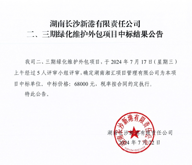 湖南長沙新港有限責任公司二、三期綠化維護外包項目中標結果公告