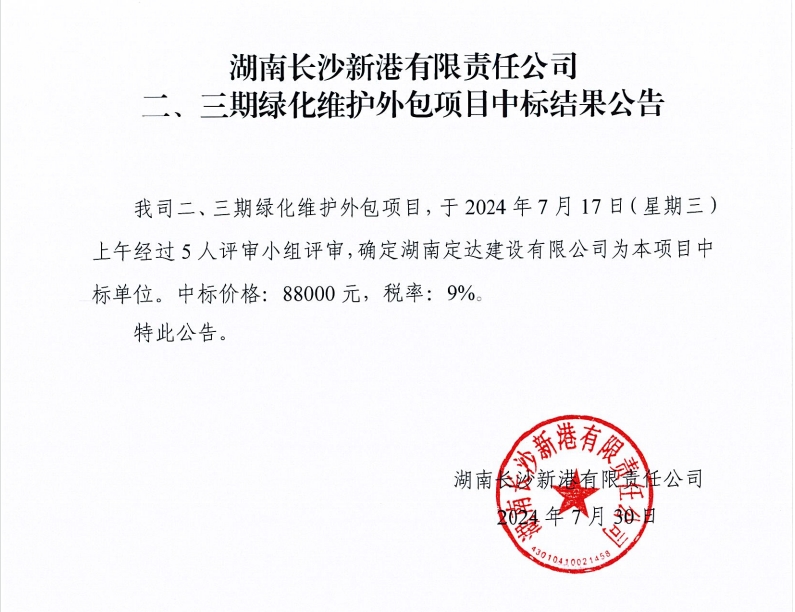 湖南長沙新港有限責任公司二、三期綠化維護外包項目中標結果公告