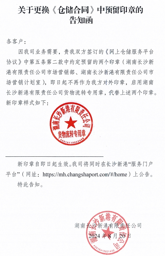 關于更換《倉儲合同》《網上倉儲服務平臺協議》中預留印章的告知函