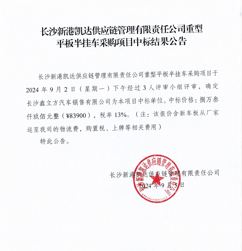 長沙新港凱達供應鏈管理有限責任公司重型平板半掛車采購項目中標結(jié)果公告